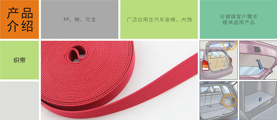 我們提供汽車專用拉鏈、標(biāo)識(shí)扣、標(biāo)識(shí)嘜、粘扣帶/刺毛帶,織帶/松緊帶,塑料扣件等其他汽車內(nèi)飾、汽車座椅系統(tǒng)部件。